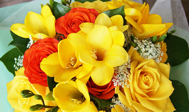 誕生日プレゼントの王道、花束を誕生月のお花で。 3月の誕生花フリージアのブーケです。 花瓶がいらない、そのまま飾れるブーケなので、受け取ってすぐにそのまま好きな場所に置いて楽しむことができます。