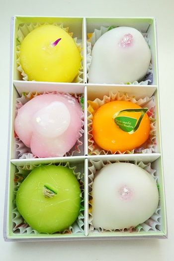 大阪松竹堂のフルーツ餅。 開けた瞬間にテンションが上がる、ホワイトデー向きのかわいらしさです。 果物の入荷によって、内容が変わることもあります。