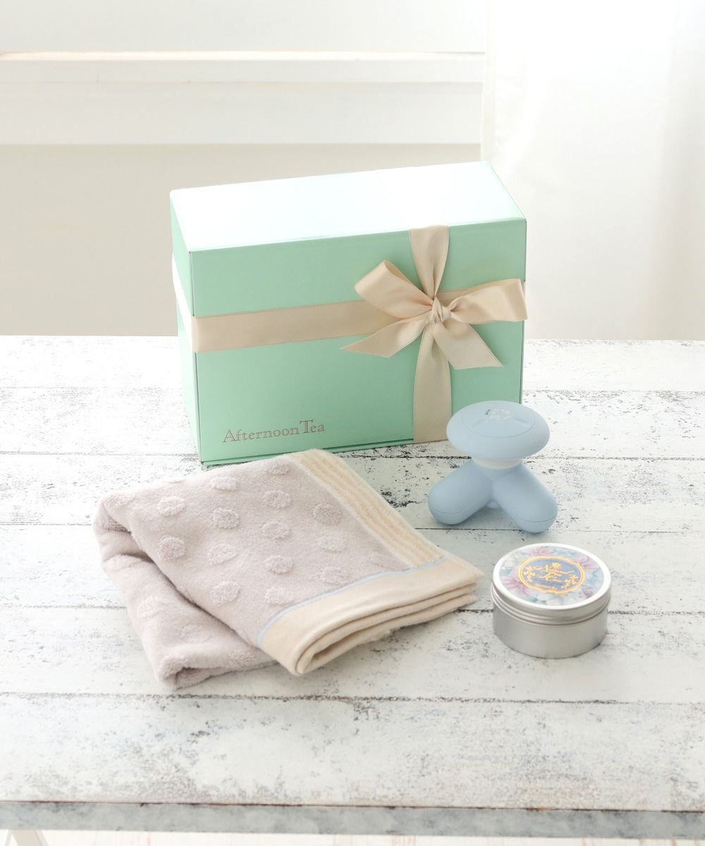 肩や腕、足などを優しくマッサージするブルブルリラクサー、ボディ&ヘアバーム、ふっくらとしたフェイスタオルのセット。 アフタヌーンティーらしい優しい色合いが素敵なセットです。 彼女の疲れを癒してくれる優れものアイテムばかりですね。