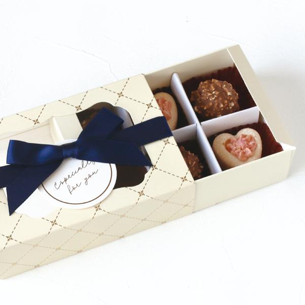 シンプルで上品に見えるデザインが手作りトリュフをおしゃれに変身! 仕切りを取ればお菓子の詰め合わせにもなります。 可愛いサテンのリボンがワンポイントになっていて、箱に入れるだけで高見えするギフトボックスはとても理想的なアイテム。