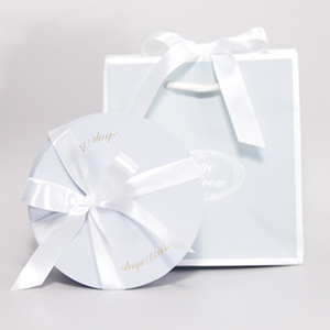 淡いブルーの色が女心をくすぐる色でとても可愛いギフトボックス。 可愛い丸型のギフトボックスはリボンが結ばれた状態で届き、ずらして中身を入れたらそのまま戻すことが出来る簡単なラッピングになっています。さらにショップバックも付いてくるのでラッピングする側には嬉しい内容。 中には、小物やヘアゴム・シュシュ・バレッタ・クリップなどのヘアアクセサリーが2~3点入るような大きさになっています。