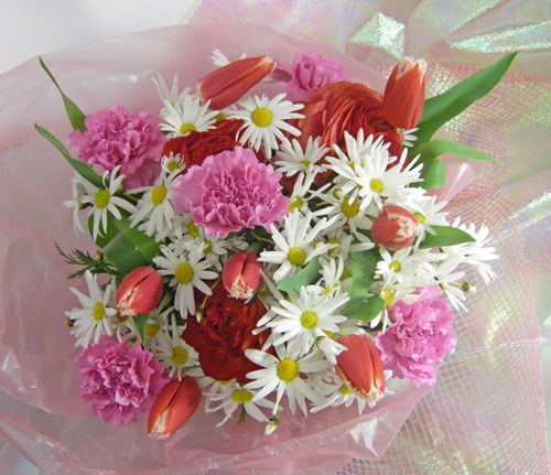 真実の愛と言う花言葉を持つマーガレットの白、ラナンキュラスの赤が対照的でステキなコントラストを生み出しています。 かわいらしい花でキュートな印象を作っています。