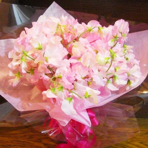 スイトピーはピンクや白など淡くかわいらしい花のイメージです。 そのために花束でも、どちらかと言うとメインの花の横に添えられるという感じですが、この花束はスイトピーだけを50本集めました。 かなりのボリュームです。 「門出」や「至極の幸せ」と言う意味をもつスイトピー、幸せになってもらいたいですね。