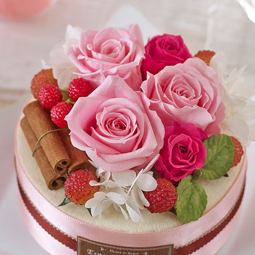 美しさを永遠に保つブリザードフラワーを使ったフラワーアレンジ。 これはケーキに見立ててデコレーションされています。 何時でも部屋のインテリアとして楽しむことが出来ますね。 結婚祝いにちょっとサプライズのプレゼント、どうでしょうか。