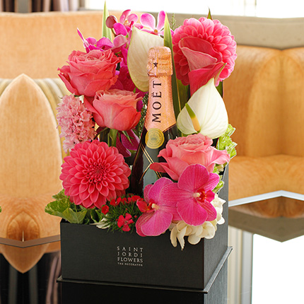 バラやダリアなどピンク系の花とモエ・エ・シャンドン ロゼ アンぺリアル が組み合わされた花のギフトボックスです。 ボックスに入れる事で形よく花が収まっています。 そのまま部屋のインテリアとしても飾れますね。