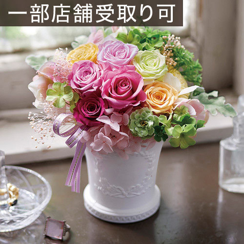 ピンク、グリーン、イエローの明るいブリザードフラワーのバラ。 白い陶器に入れられ、部屋の中をぱっと明るくしてくれるフラワーアレンジメントです。 結婚と共に新居に移るそんな人たちへの結婚祝いにピッタリです。