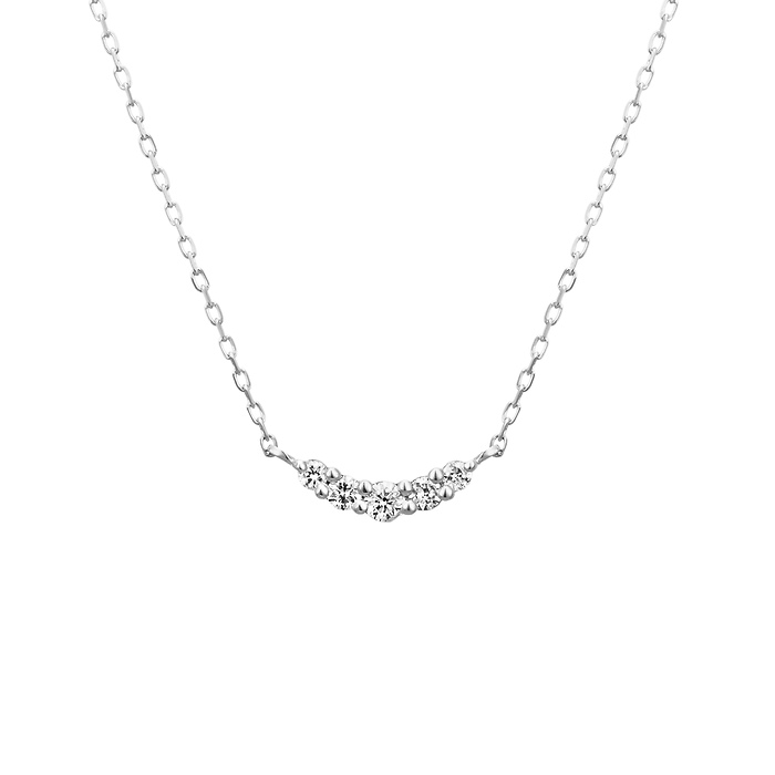 胸元で、カーブラインのダイヤがきらめくネックレスです。 ホワイトゴールドの上品な輝きが、女性らしさを強調します。 フォーマルなシーンで胸元を飾る洗練されたデザインは、社会人の彼女や妻へのプレゼントにおすすめです。 一生使えるおすすめのネックレスです。