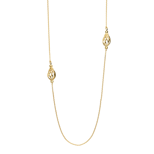 シンプルでベーシックなトップスを着ることが多いという女性には、胸元に華やかさを加えるロングネックレスがおすすめです。 大人の女性の落ち着きも感じられ、かつさりげなく個性も演出することができます。 ベーシックなゴールドチェーンとらせんフォルムの2つのチャームが特徴的です。