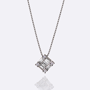 どの角度から見ても美しいスクウェアカットのネックレスです。 シンプルなデザインながらも他と一歩差をつけるおしゃれなジュエリーです。 チェーンはプラチナなので、肌にも優しくまた見た目も上品なデザインになっています。