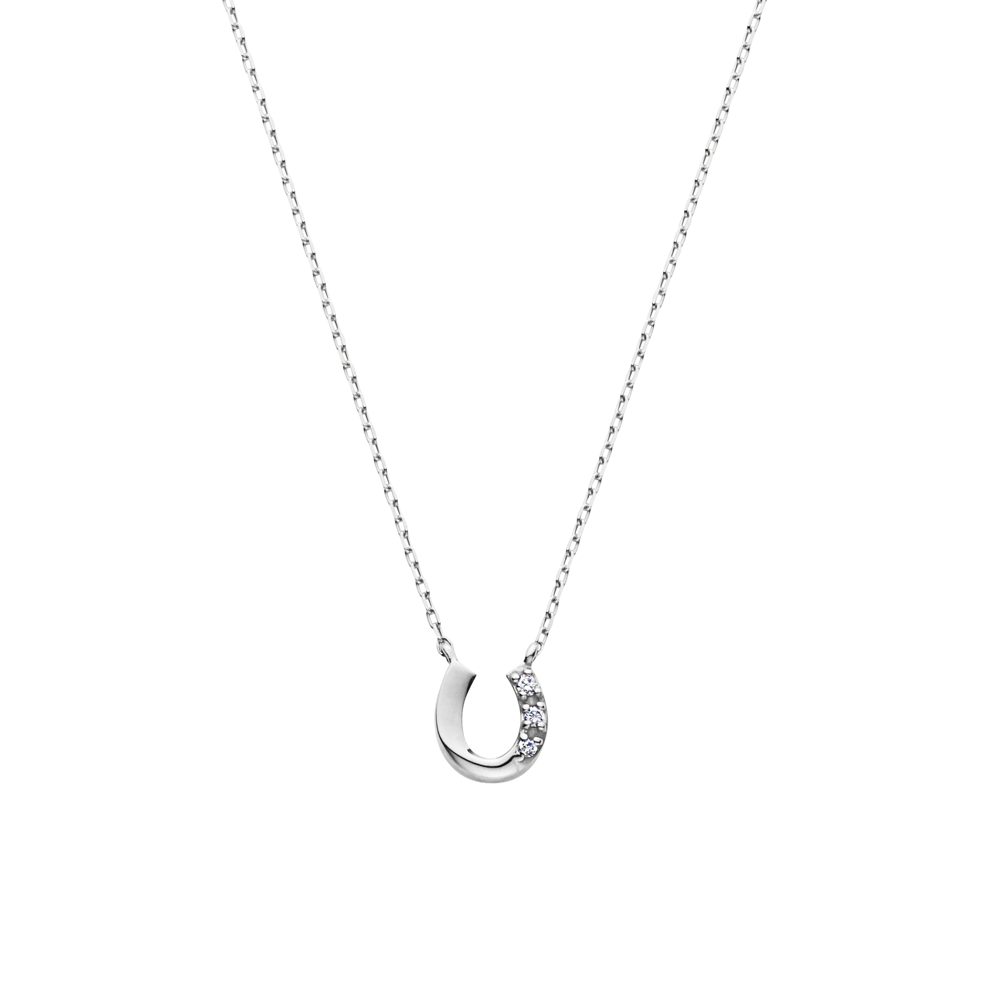ホワイトゴールドとダイヤモンドをホースシューに描いたネックレスです。 ひねりを加えたつややかなチャームは顔周りを華やかに見せてくれます。 ホースシュー(馬蹄)は「幸運を呼び込んで逃さない」と言われており、大切な人の幸せを願うプレゼントにもなります。