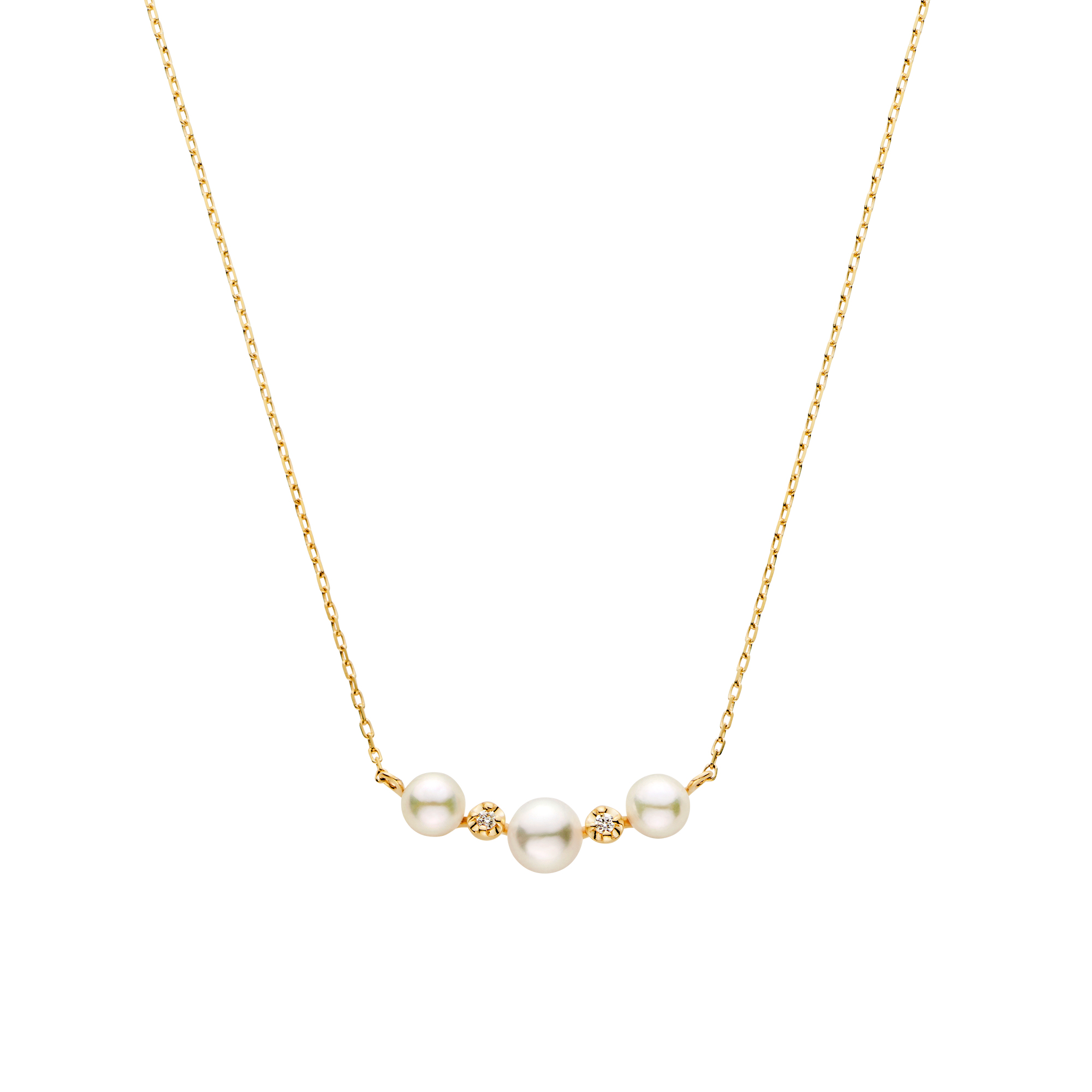 アコヤパールとダイヤモンドのメリハリが美しいネックレスです。 パールの柔らかい輝きとダイヤのつややかな光沢が、女性の肌を美しく見せてくれます。 ダイヤモンドの台座に角度をつけているので、光に当たると様々な角度にダイヤが輝きます。 華やかな場面やプライベートなど様々なシーンで女性を華やかに演出してくれるネックレスです。
