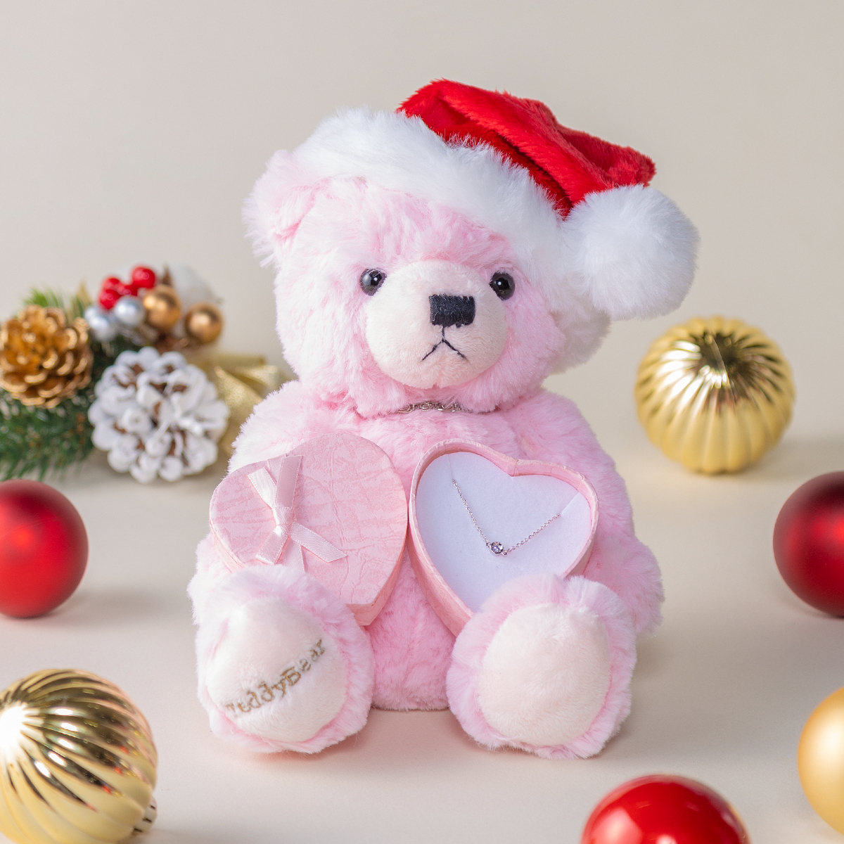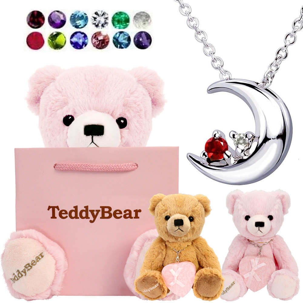ふわふわで可愛いテディベアのぬいぐるみと、誕生石のネックレスがセットになりました。