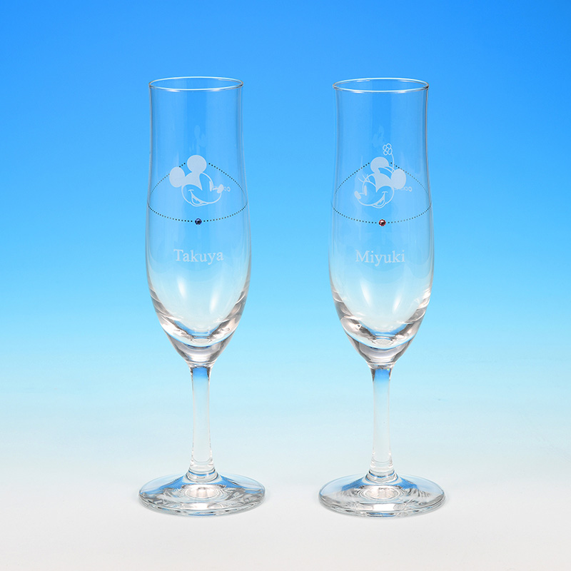 結婚した二人の名前をそれぞれグラスにレザー彫刻出来る、ミッキーとミニーのペアグラスです。 ミッキーにはブルー、ミニーにはピンクのスワロフスキーがついています。 可愛すぎないおしゃれなデザインで、2人でゆっくりお酒を楽しむときにも活躍してくれるアイテムです。 グラスを並べるとミッキーとミニーが見つめ合うデザインの、結婚祝いにぴったりのペアグラスです♡ 価格:8,640円