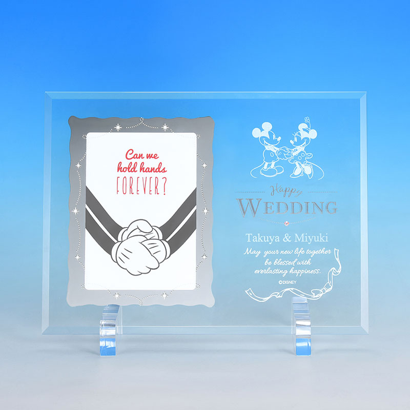 ミッキーとミニーがデザインされた、結婚祝いにぴったりのフォトフレームです。 キラキラ輝くラインストーン付きで、二人の名前をレザー彫刻する事が出来ます。 価格:12,960円