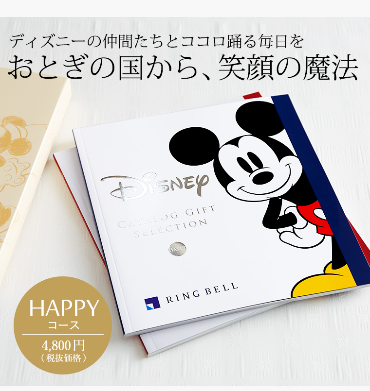 ディズニーグッズ約80点の中から選べるギフトカタログ「ハッピーコース(税抜:4,800円)」です。 掲載されているグッズは全てディズニーデザイン♡ ディズニー大好きな二人への結婚祝いにピッタリですね。 キッチングッズからアウトドアアイテムまで、豊富に掲載されています。