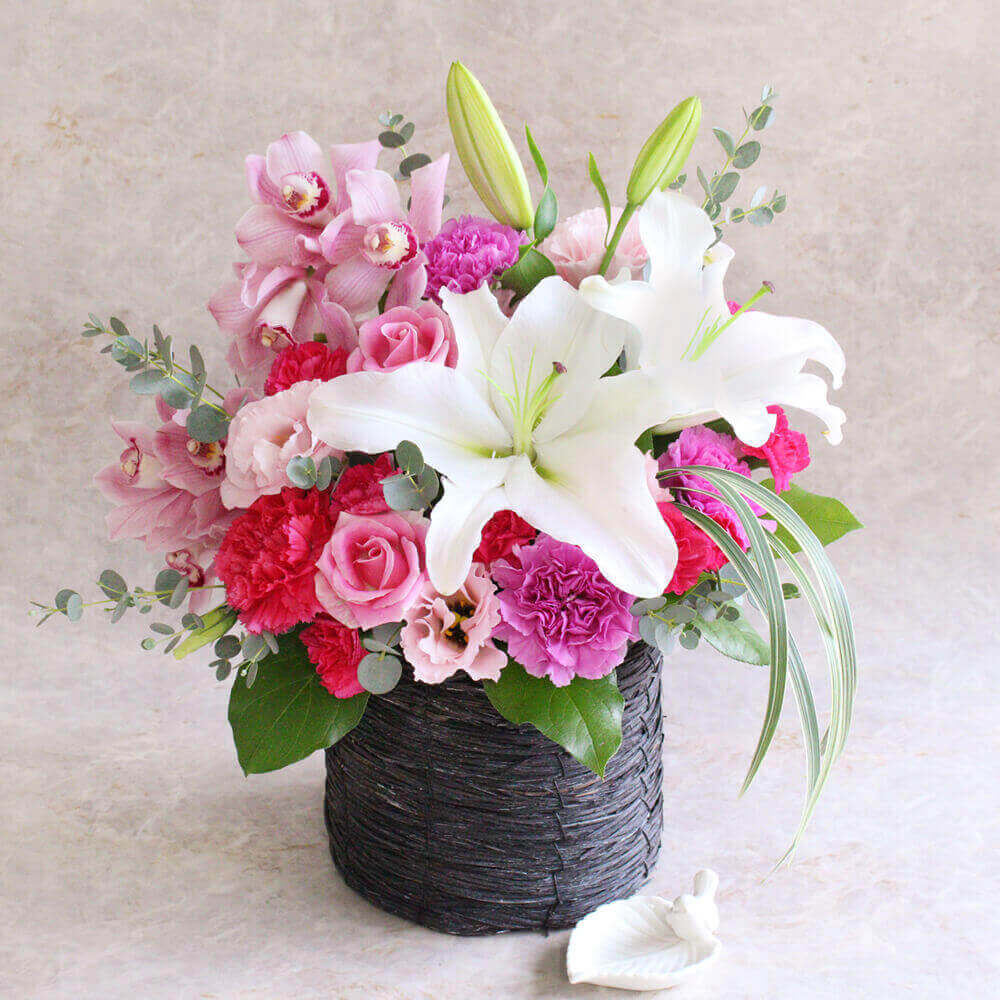 豪華でゴージャスなイメージのカトレア。 あっとカラフルで明るくなる素敵なバラとカトレアのアレンジです! 少し小さ目で可憐な印象のミニカトレアも人気です。 花言葉は「優雅」「品格」です。