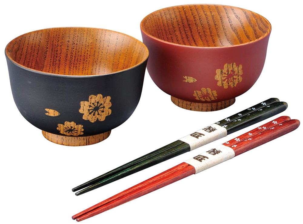 お椀などの木製品は、落としても割れないことから縁起のいい贈り物とされています。 天然木の木肌の感触も毎日の食卓を上質なものにしてくれそうです。 桜の花のモチーフのかわいいお椀と、漆塗りのお箸のセットは結婚祝いにぴったりですね。