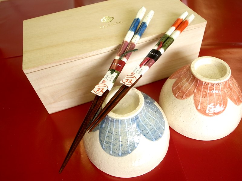 【花遊心 お茶碗とのセット】 和紙を感じさせる明るい色柄の一双の塗りの夫婦箸とご飯茶碗のセット。 お茶碗は、花びらのようなデザインがおしゃれです。 毎日の夫婦の食卓を明るく楽しいものにしてくれそうなギフトですね。