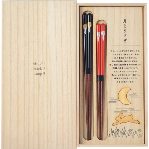 うさぎは月の使いとされていて「ツキを呼ぶ」という語呂合わせで縁起のいい動物とされてきました。 赤と黒の輪島塗の夫婦箸とセットになっているのは、月とうさぎの箸置きです。 桐の箱にぴったりと月とうさぎがはめ込まれていて、縁起の由来が書いてあるところもいいですね。 縁起のいい動物に由来の夫婦箸と箸置きのセットなら、いっそう喜ばれるのではないでしょうか。