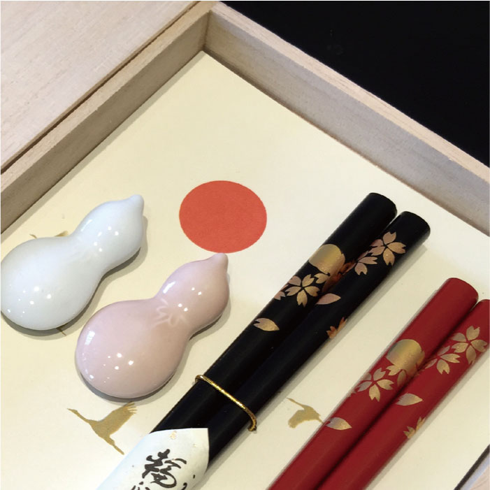 【「兵左衛門」桜月夜 夫婦セット 箸置き付 】 おめでたい紅白のひょうたん型の箸置きが付いた夫婦箸セット。 ハッピーウェディング仕様の桐箱に入っていて結婚祝いのギフトに最適です。