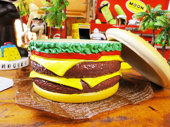 本体はレジン製なので重量感あってかなりドシッとした作り。 その重量感あるフタを持ち上げると、中が小物入れになっています。 こんなのテーブルに転がってるだけで、楽しいお部屋になっちゃいますね。 アメリカ人のホームパーティーでありそうなポップで賑やかなシーンが 好きな人なら、絶対オススメのハンバーガー小物入れですよ!