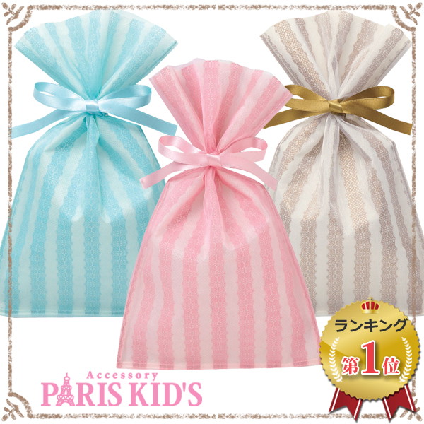 このPARIS KID'Sのラッピング袋の大きな特徴は、リボン結びが手軽にできるところです。 巾着みたいに袋をリボンで結ぶのって、意外と面倒なんですよね…。 一見、簡単そうに見えるので自分でも出来るだろうと思いきや、思いのほか難しくて結局ぐちゃぐちゃになってしまった苦い経験があります。 プレゼントをもっと良くしようとして、ラッピング袋を買ったはいいものの、肝心の装飾が上手くできなかったら凹みますよね。 面倒な作業は省きたい!そんなアナタにおすすめです。 やや可愛いめのラッピング袋ではありますが、水色などの男性受けしやすい色もあるので、男性へのプレゼントにも使えると思います。 ちなみに、こちらは前面が先ほど説明したオーガンジー生地になっていますので、中身が見えるタイプのラッピング袋になります。