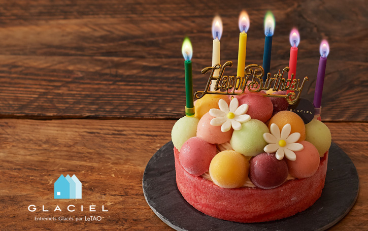 チーズケーキで有名な北海道小樽「ルタオ」がプロデュースするアイスケーキです。 マンゴー、木苺、青リンゴのシャーベットが、まるで花束のように飾られ、見た目も華やか! 家族の誕生日用にリピートする人が多いのも納得です。 こちらはバースデー仕様なので、ローソクとプレートがセットになっています。