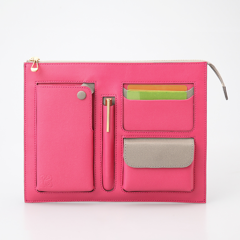 CYPRIS(キプリス)のカジェットクラッチバッグです。スマホポケット、ペン収納、カード収納と小物ポケットがバッグの表面におしゃれに配置されており、とっても便利!上質な牛革でできているので丈夫で、長く愛用してもらえます。