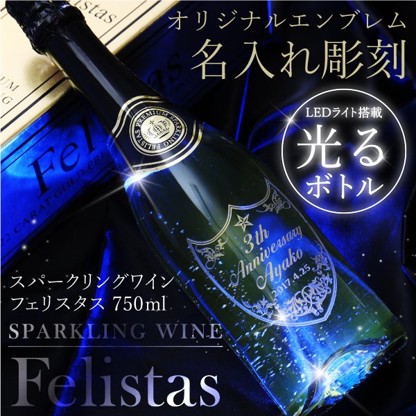 盛り上がること間違いなし!光るボトルのスパーリングワインです。ボトルのエンブレムには、名前だけでなく日付とメッセージも入れることができ、たったひとつの特別なボトルにすることができます。お酒の中に金箔も入っていてとても豪華です。