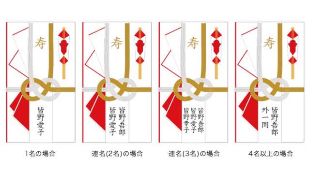 出産祝いは職場の人や友達と連名でお金を包むことも多い思います。 連名でお金を包んだ時の書き方もしっかり覚えておきましょう。 まずは、夫婦連名は表書きの下に夫のフルネームを書き、その左に妻の名前を書きます。 職場の同僚や友達の場合は順番は関係ありません。 ただし、4名以上の場合は代表者一名の名前を書き「外一同」とします。 お金を包んだ全員の氏名を書いた紙を中包みに同封します。