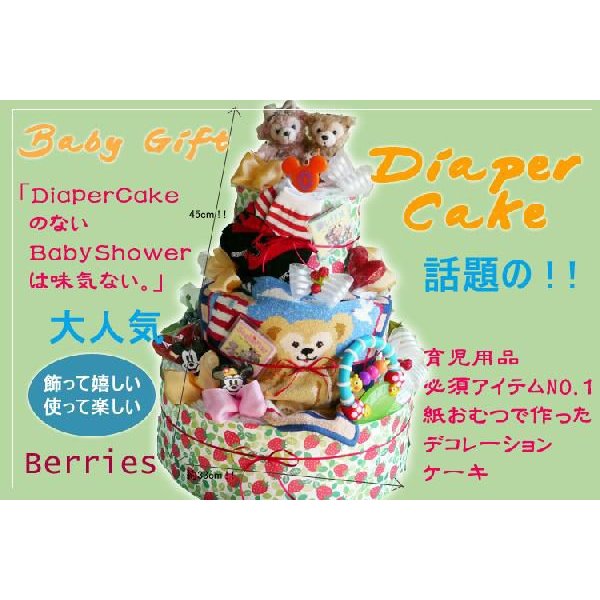 赤ちゃんとお母さんに取っておむつはいくつあっても足りないもの。 ダッフィーのキャラクター商品とオムツケーキのセットは、新米ママにとってぴったりの出産祝いです。 ケーキに使うオムツの数によって、予算に合わせる事が出来るのも良いですね。 入っているものはおむつに、ダッフィーのタオルやぬいぐるみ、それに赤ちゃん用のおもちゃが入っています。
