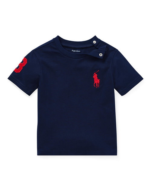 大人っぽいネイビーのTシャツ。 大きなポニーの赤の刺しゅうがぱっと目を引くデザイン。 赤ちゃんにもおしゃれして、おでかけしたくなっちゃいますね! パパとお揃いにしてもいいかもしれません! ネイビー以外に、グリーン、ブルー、イエローもあります。