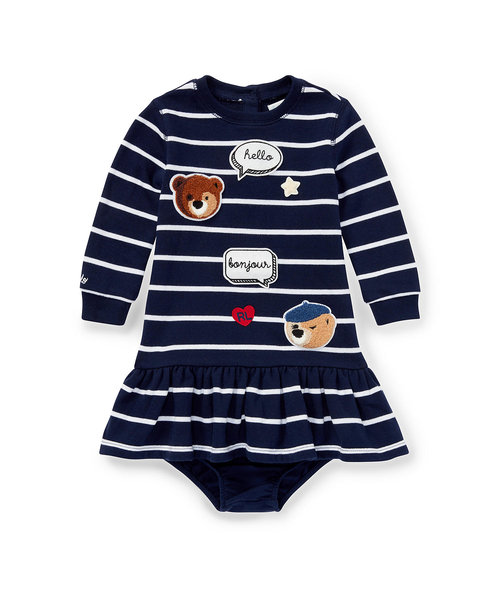 Poloベアの刺繍と全体にあしらったワッペンで楽しいデザインのドレス。 普段用やおでかけ用にもなるおすすめ商品です! 友達への出産祝いにいかがでしょうか。