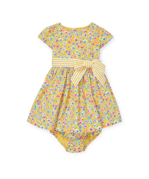 大きなボウサッシュと全体に施したフラワープリントがビビットな色合いで、華やかなドレス。 色はイエローとピンクがあります。 華やかなデザインのドレスと、同じ柄のブルマーのセット。 夏のおでかけが、楽しくなりそうですね。 友達や同僚への出産祝いにおすすめです!