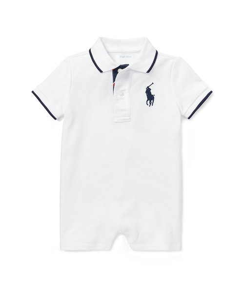 半袖の白いポロシャツのデザインのショートオール。 普段にも、フォーマルにも使っていただけます! 上品で、これ一枚でかっこよく着こなせます。 出産祝いにとても喜ばれています! 白とネイビーがあります。