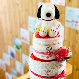 男の子にも女の子にも人気のスヌーピーのおむつケーキ。 スヌープーのぬいぐるみとウォッシュタオル2枚がセットになっており、パパやママにも喜ばれること間違いなしです。