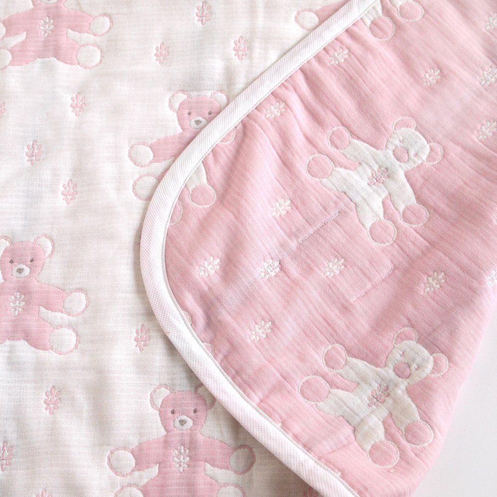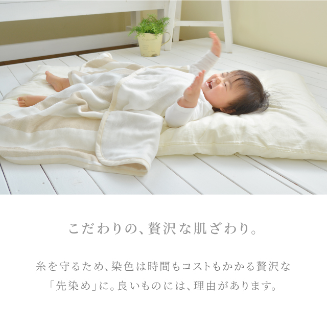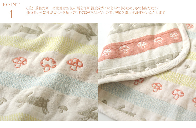 6重ガーゼ構造の秘密は、『涼しい、だけど暖かい』です。 このガーゼの層に空気が入り、夏は通気性が良く、冬は冷気を遮断してくれます。 まさに赤ちゃんを守る最高の鎧ですね! ガーゼは傷口に当てて良くて使われますが、空気の通りが良くて、むれないということは赤ちゃんが快適な証拠です。