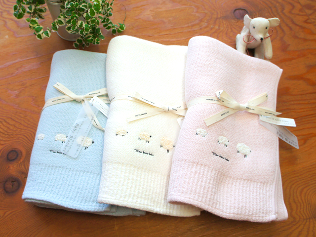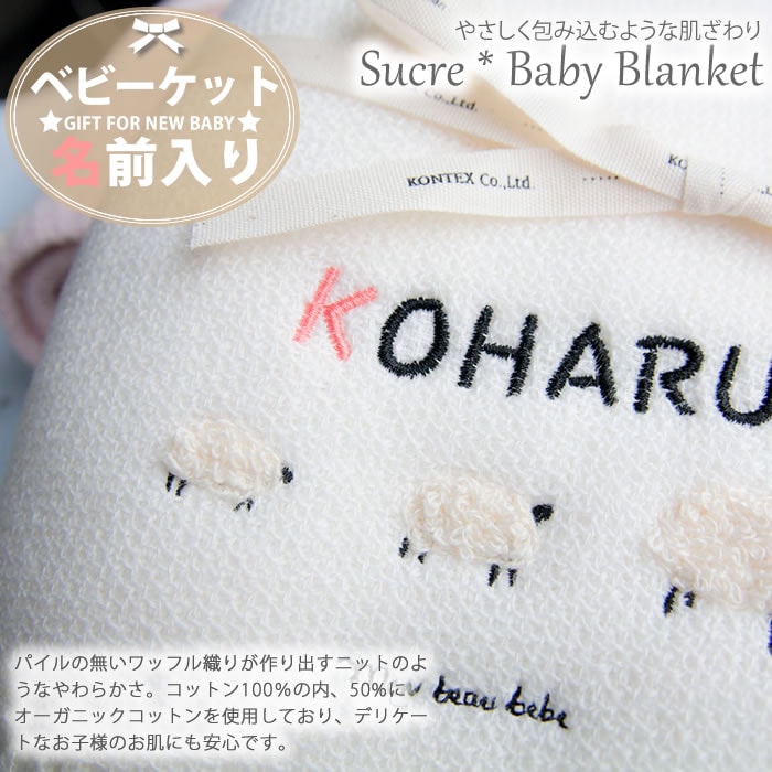 もこもこのヒツジ刺繍がかわいいワッフル素材は、ニットのような柔らかさを感じさせます。 軽くて包み込むような肌触りは、赤ちゃんのデリケートなお肌にピッタリですね! こだわりのベビーケットに、お子様の名前を刺繍でお入れします! 出産祝いに贈ってくださいね。