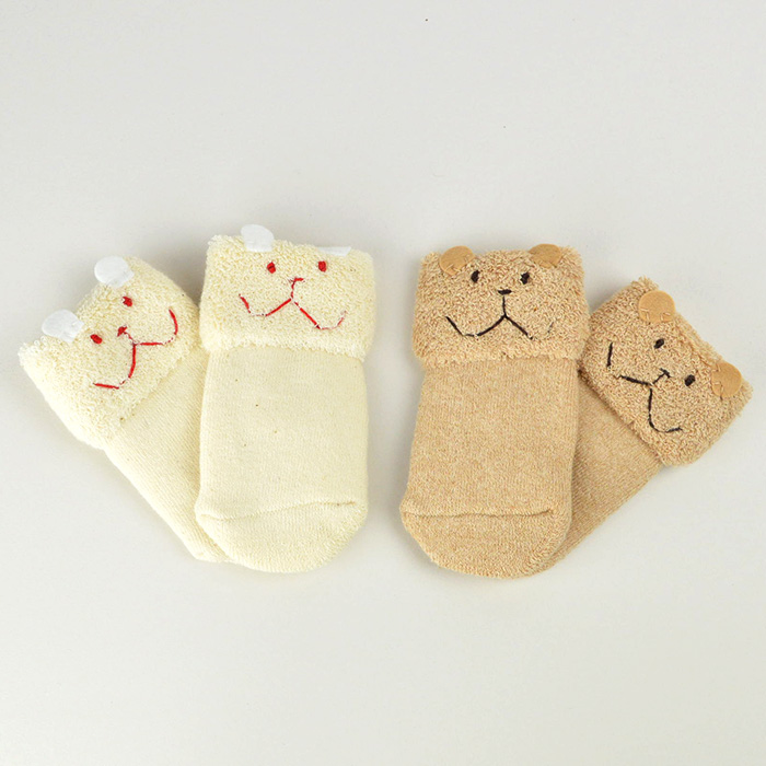 お肌に優しい、オーガニックコットン素材のベビーソックスです。 くまちゃんとうさぎちゃんの顔は手刺繍で丁寧に作られています。