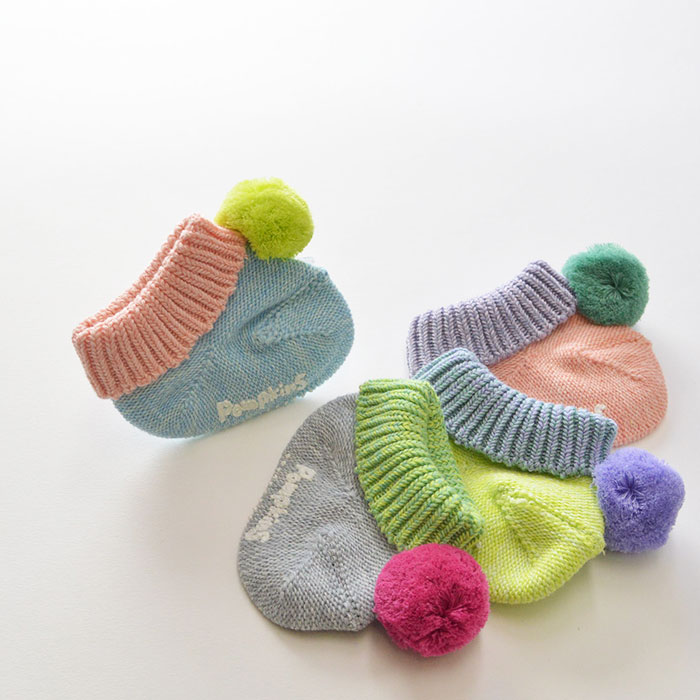 見ているだけでワクワクしてしまうようなカラフルなベビーソックス。 足の甲についた大きなボンボンが可愛さ倍増です。