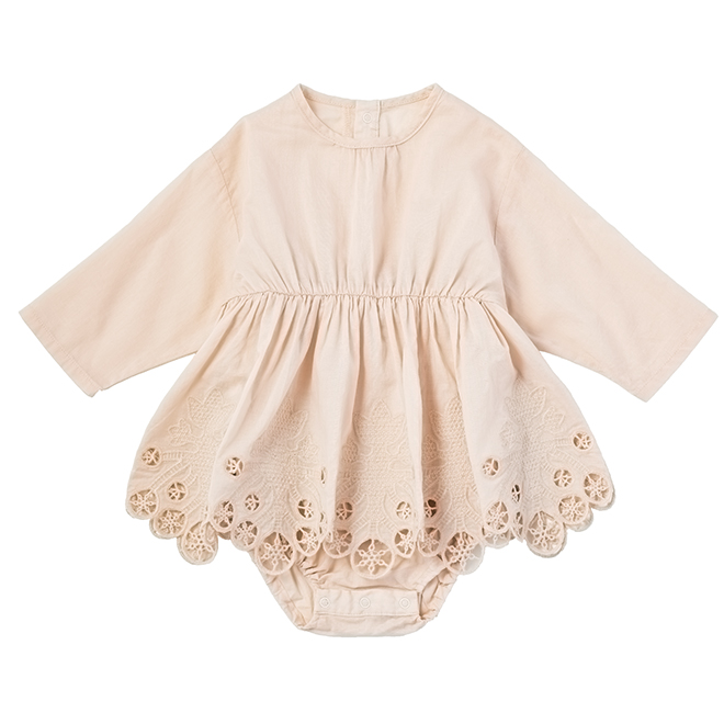 新生児のときはワンピース型、足の動きが活発になってきたらカバーオール型にできるので、長い間着てもらえるのが魅力的。 ふわふわの手触りは、赤ちゃんにも優しいので好評です。