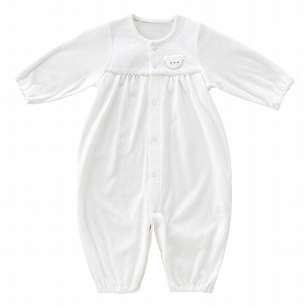 素材にこだわった日本製ベビー服も出産祝いでは人気。胸元のくまのモチーフがかわいいツーウェイオールです。 生まれてすぐは足を包むドレスタイプ。足を動かせるようになったらボタンを留め替えてカバーオールとしても使えます。