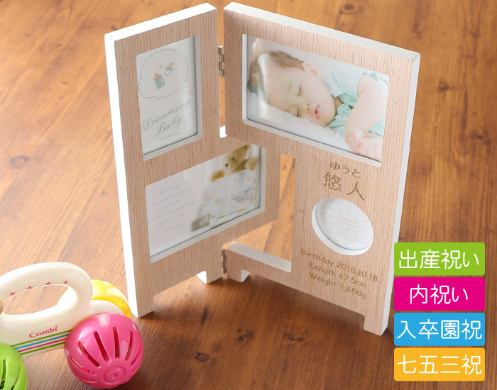 パーテーション型のフォトフレームで、木目がお部屋に馴染みます。 温かみのある天然木に、赤ちゃんの名前を入れて下さい! 出産祝い用に赤ちゃんの名前や体重も入れてくれますよ。