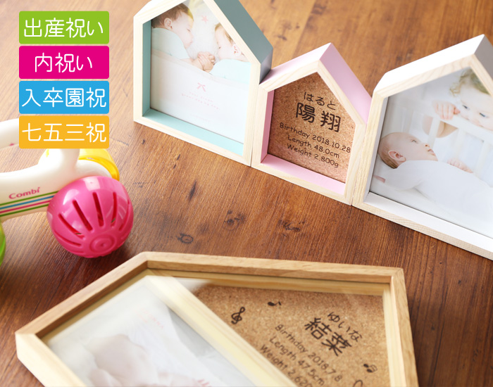 カラフルでキュートな家が並んだフォトフレームです。 真ん中のお家に『お名前』や身長、体重などを記録できます。 忘れられない出産祝いになりそうですね!