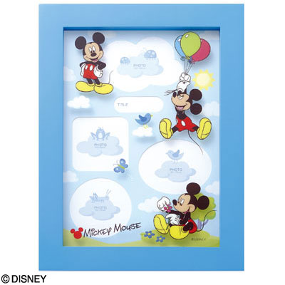 透明番にミッキーが印刷されていて、写真の台紙との間に空間があるので、ミッキーが立体的に見えます。 もちろん、スタンドでも壁につるすこともできます。 A4版の大きさで、5カットが飾れて、化粧箱もついています。 赤ちゃんの写真を入れて、ご両親にプレゼントしてもいいですね。