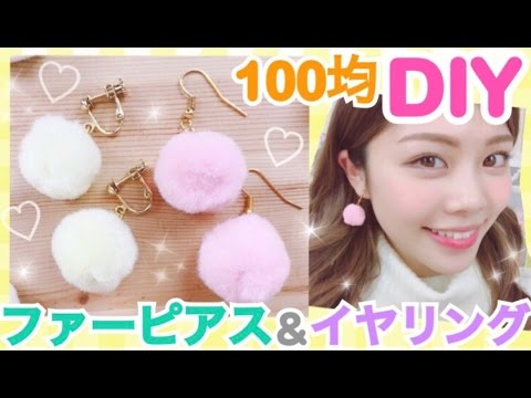100均で売っているフェイクファーとピアス用金具で 簡単ふわふわピアスができます。 Tピンをフェイクファーに通して、 丸環でピアスの金具とつなぎ合わせます。 金具をかえればイヤリングに作り替えることもできます!