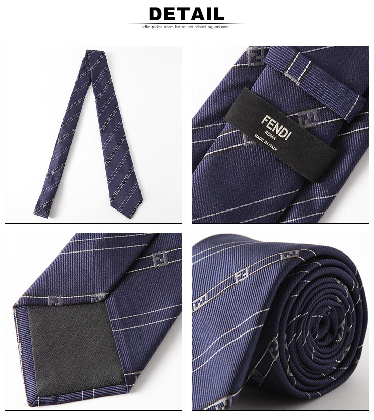 フェンディ―の頭文字の『F』をモチーフにしたエレガントに仕上げたネクタイです。 裏にはシンプルにブランドネームをあしらってポイントにしています。 ブルー系で上品なカラーリングは魅力ですね。 ビジネスから華やかなシーンまで活躍してくれそうです!