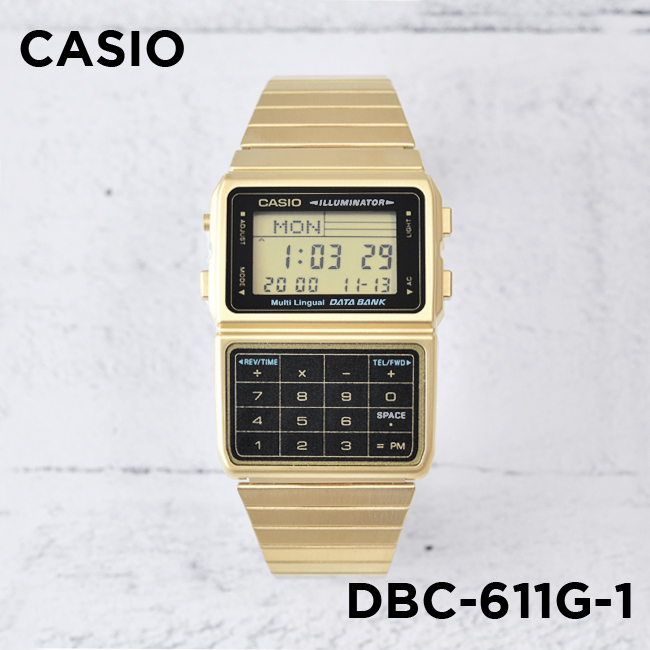 レトロフューチャー感のあるゴールドとブラックのデザインが素敵な腕時計です。 計算機能に、通貨換算機能、電話番号を記憶するテレメモ機能がついています。 暗闇でも光るLEDライトもついていてとっても便利です。 学校の試験には持ち込めませんね!