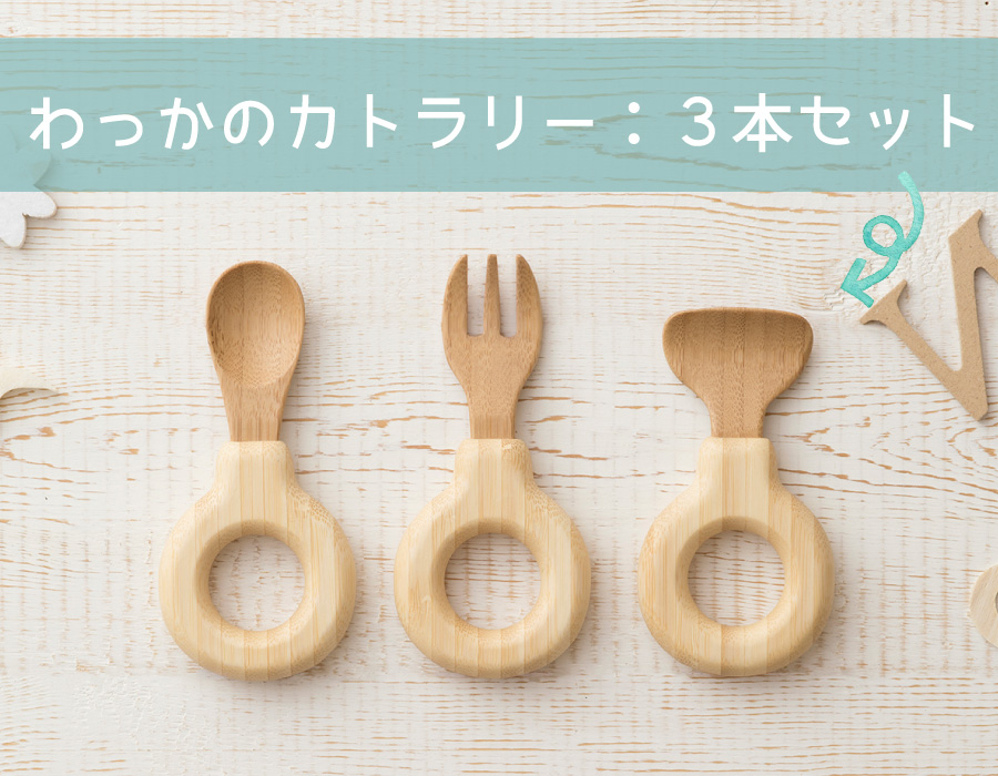 わっかがついた可愛いデザインのカトラリー3本セットです。 わっか部分をフックにかけて乾かす事が出来るので、衛生的に使えます。 天然竹素材で、マッシャー、スプーン、フォークの3本セットです。 価格:3,240円