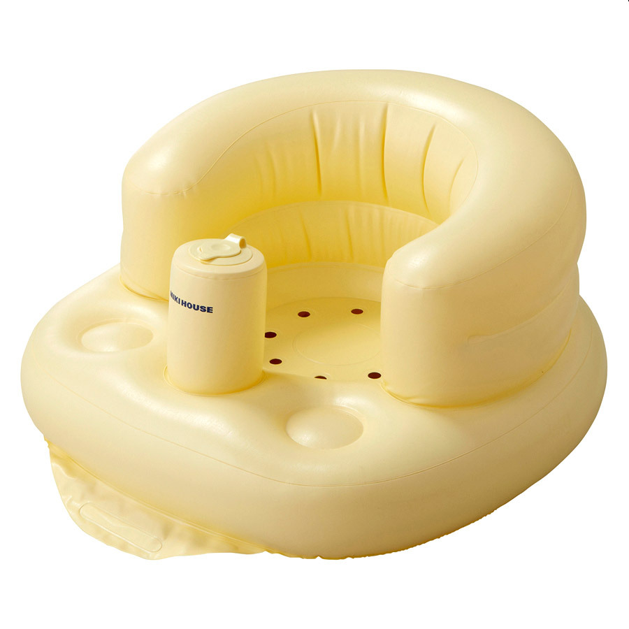 お風呂で使える沐浴用のふわふわベビーチェアです。 すべって転んでしまう心配もなし。 もちろんお部屋でも使えます。 空気を抜けば持ち運びも便利です。